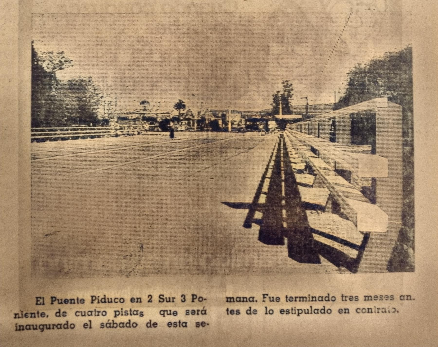 Extracto de nota de prensa con la inauguración del Puente Piduco ubicado en calle 2 Sur con 3 Poniente. Dicho puente, con cuatro pistas, se mantiene vigente hasta el día de hoy.